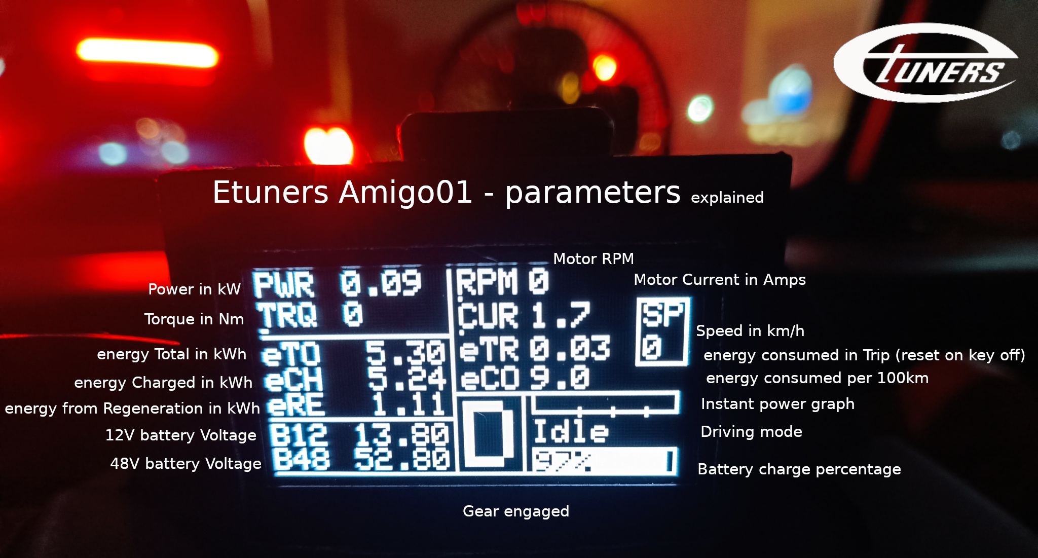 Amigo01 cannot change or intervene with the electric motor’s management system. It is a monitoring tool that connects to the car via OBD2 and reads parameters. It connects on a diagnostic layer and displays data that is useful to the driver. For collection and analysis. It can read all of the parameters shown in the photo above.