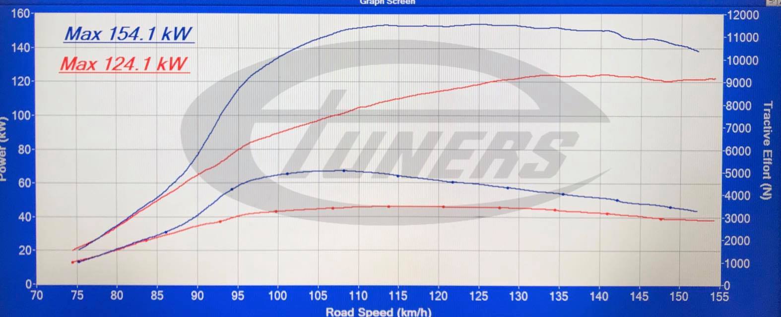 - Maximum wheel power: 154wkw (measured stock 124wkw), gains 30wkw