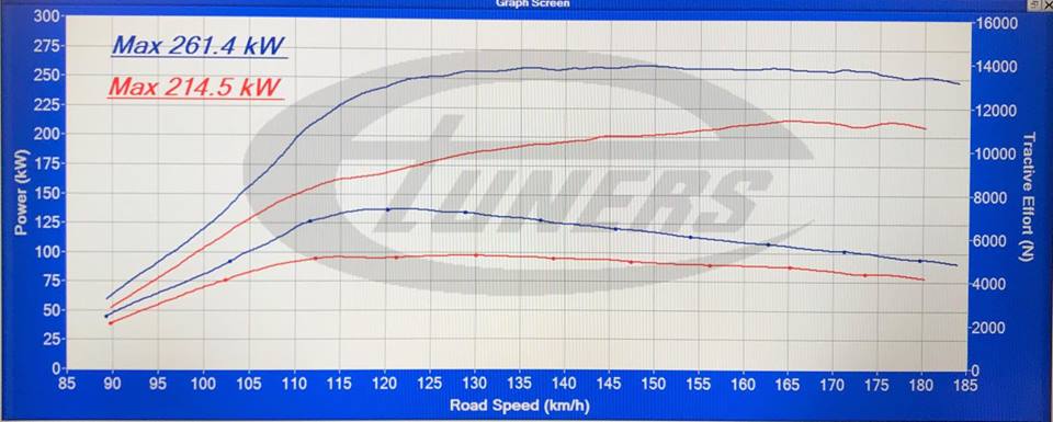 We supplied and installed a custom hi flow downpipe and loaded Etuners stage 2 ECU and TCU calibration files. Peak power increased to 261kw @ all 4 wheels, up from 214kw as measured stock. With a strong flat power curve through the entire rev range this is a cost effective package on a budget.