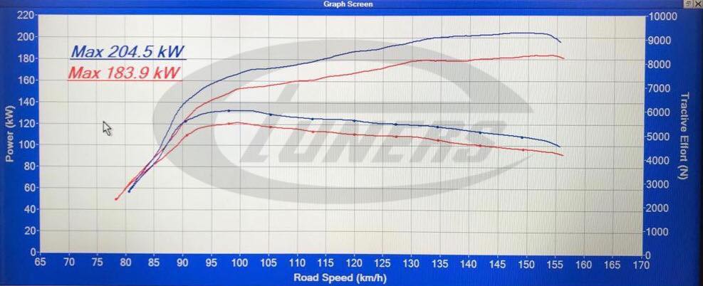 - Maximum power at the wheels: 204.5 kW (measured stock as 183.9kW), gains 20.6 wkW