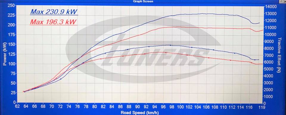 - Maximum power at the wheels: 231wkw (measured stock at 196wkw), gains 35wkw