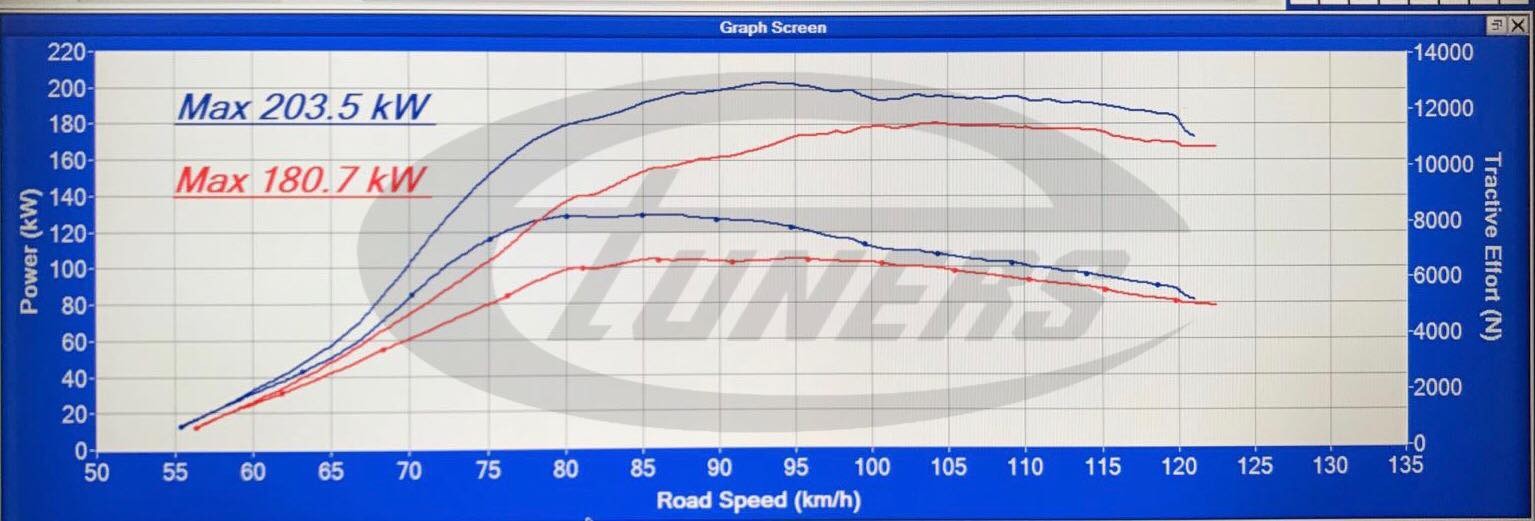 - Maximum power at the wheels: 203.5 kW (measured 180.7 kW stock), gains 22kW at the wheels