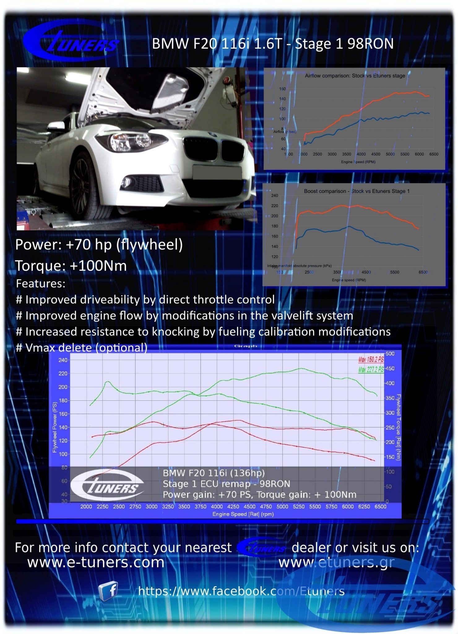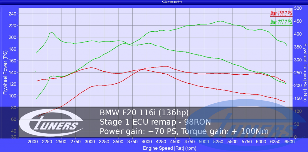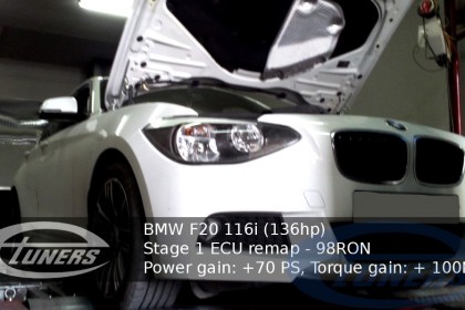The BMW 116i 1.6T F20 produces around 136hp, based on the manufacturer’s claims. In reality, the stock power output is much higher. On the dyno it makes about 150hp, which is expected based on the calibration settings and its turbo size. This engine comes with the Valvetronic system on the cylinder head, controlling valve lift and a variable cam timing system for both the intake and exhaust cams. BMW has equipped it with the best available options and it shows.