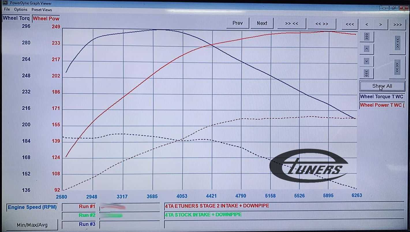 - Maximum wheel power: 249whp (measured stock with upgraded parts at 165whp), gains 84whp
