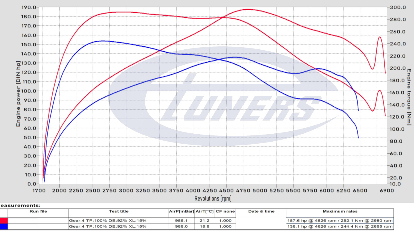 Maximum engine power: 188hp (measured stock 136hp), gains 52hp