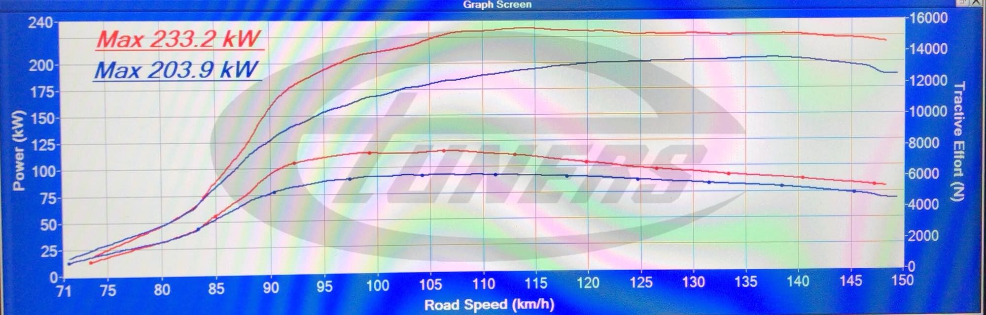 - Maximum wheel power: 233.2 kW (measured stock as 203.9kW), gains 29.3kW
