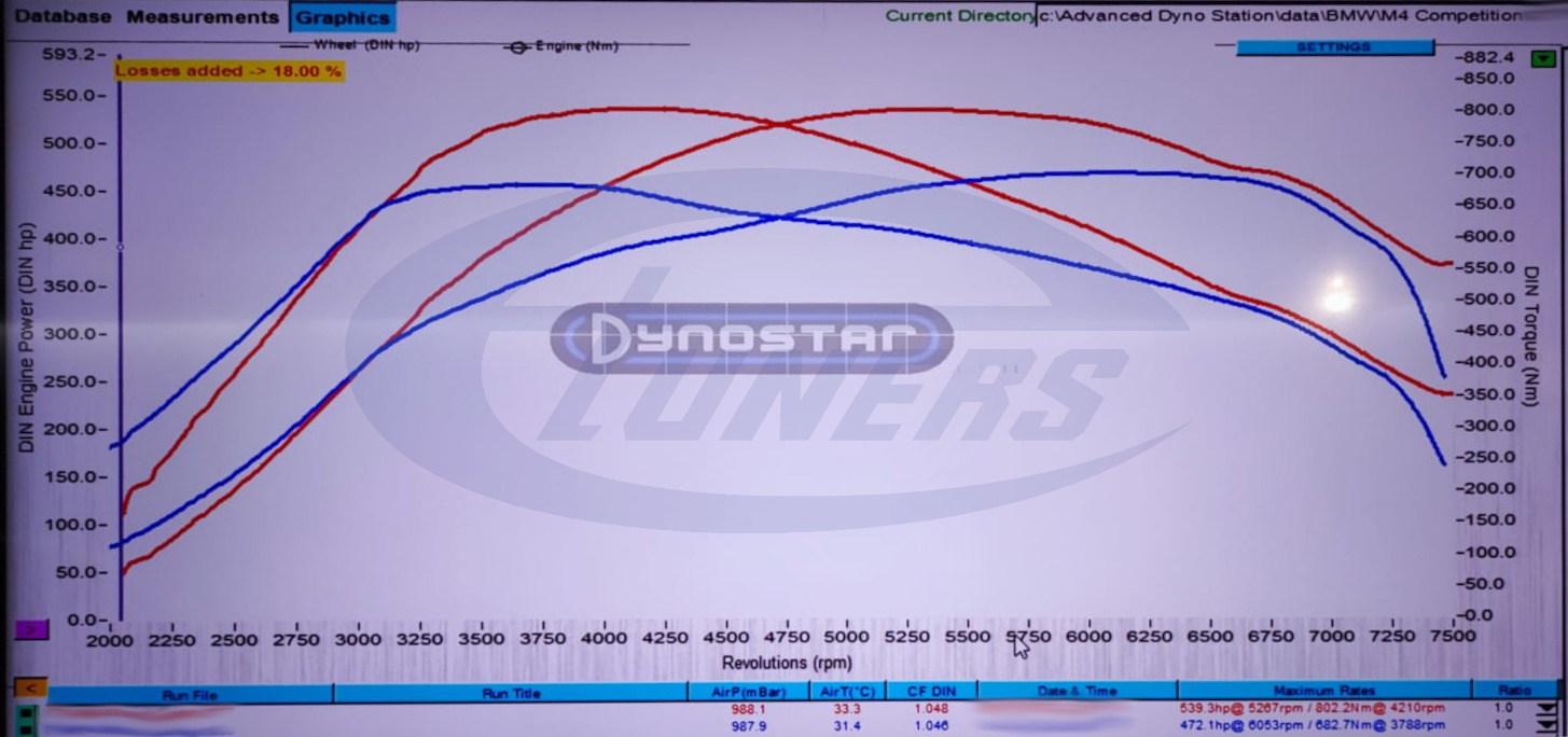 - Maximum engine power 539hp (measured stock with upgraded parts 472hp)