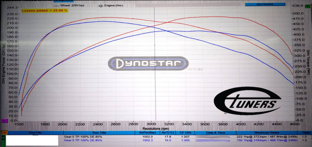 - Maximum engine power: 222hp (measured 193hp on stock software), gains 29hp