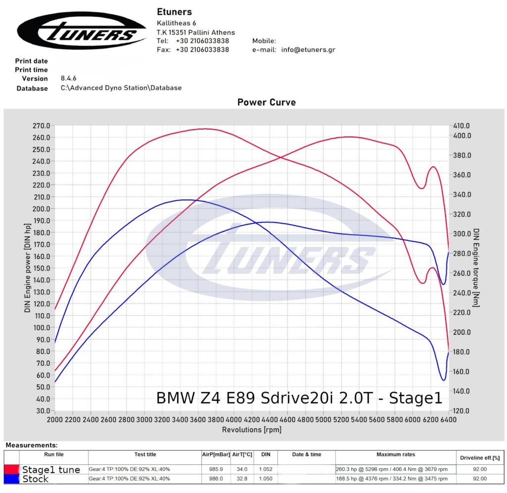 Μετρήθηκε εντελώς εργοστασιακό στο δυναμόμετρό μας στους 189 ίππους με 334Nm ροπής, με μόλις 55χιλιάδες χιλιόμετρα στο κοντέρ. Εξελίξαμε πρόγραμμα 1ου σταδίου #etuners και η ισχύς ανέβηκε στους 260 ίππους με 406Nm ροπής. Ο κινητήρας αποκτά τη μέγιστη απόδοση στα driving mode Sport και Sport+, ενώ στα υπόλοιπα modes και σε καθημερινή λειτουργία περιορίζεται σε χαμηλότερη και λιγότερη νευρική συμπεριφορά ώστε να μην κουράζει μέσα στην κίνηση.