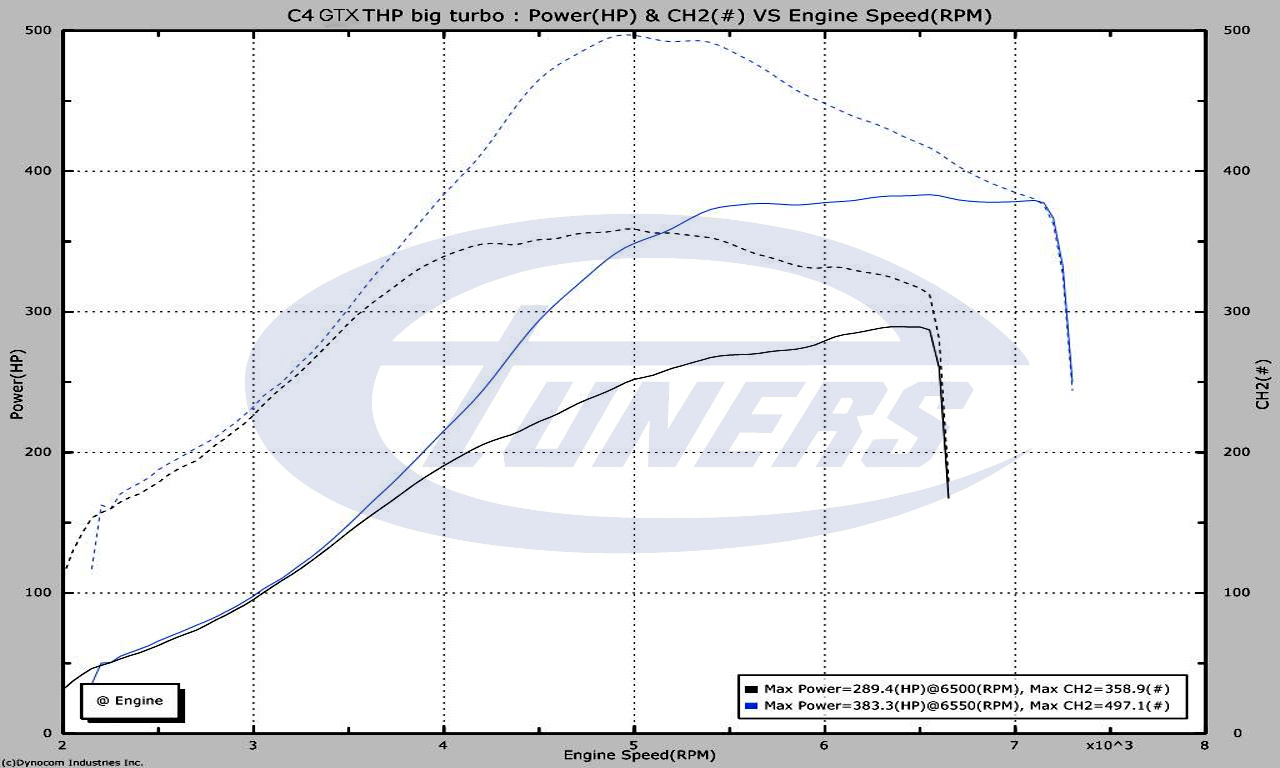- Maximum engine power: 383hp at high boost settings (measured 289hp at 1bar)