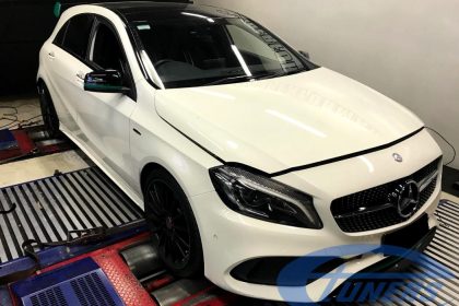Mercedes A250 is the younger sister of the A45 AMG. With a 2liter turbo engine, 4matic AWD system and 7G-DCT gearbox make this package very attractive for tuning. This particular car was made in 2015 and also received an upgraded downpipe with a sports cat.