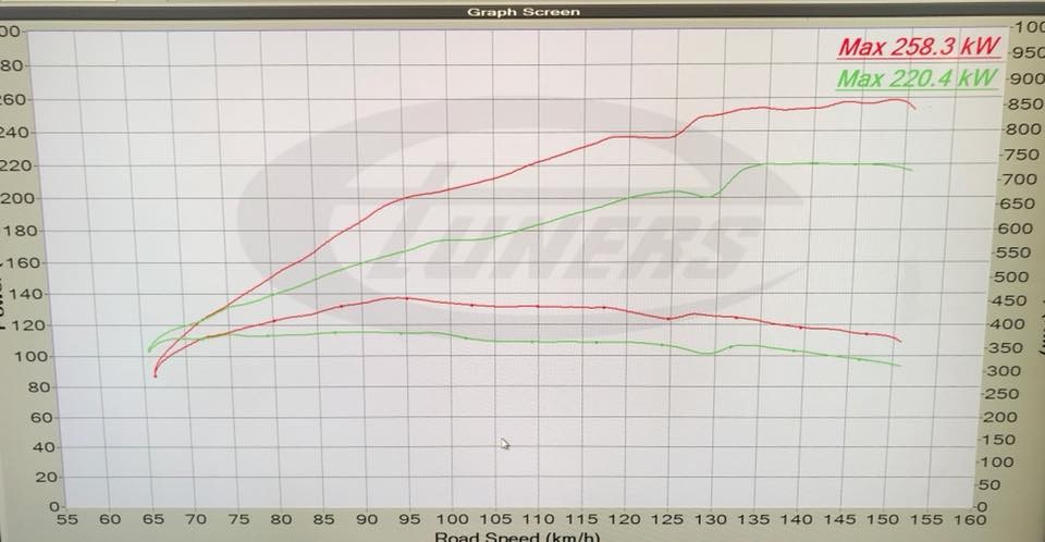 - Maximum power at the wheels: 258.3 kW/351whp (measured stock with upgraded intake and downipipe at 220.4kW/299.7whp), gains 38.3kW / 52whp