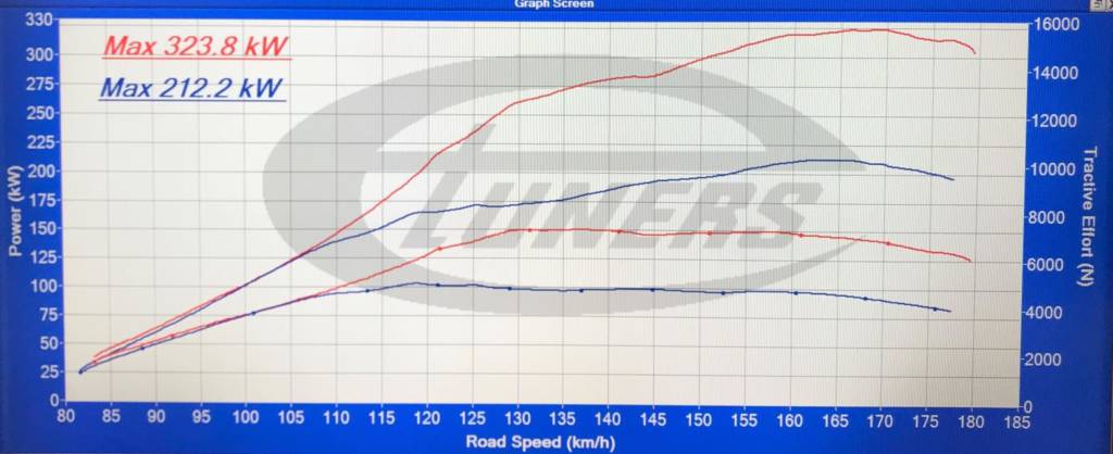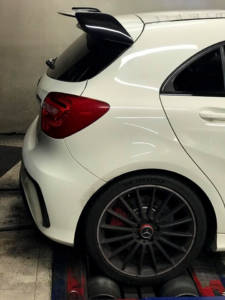 Power increased to an impressive 323kw @ all 4 wheels up from a stock 212kw. With midrange gains of +100kw and power staying strong to red line, the A45 charges through the gears turning all 4 tyres on the shifts.