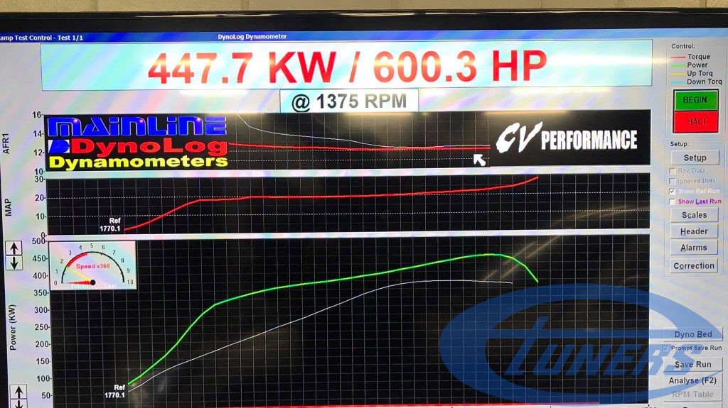 As delivered with stage 2 hardware and tune a best of 368kw at the wheels was recorded, using the Mainline hub dyno at CVPerformance. For this project, we worked with DIME RACING, who provided us with a set of hybrid turbos for the AMG GTS. After the install and custom calibration peak power rose to 447kw or 600.3hp measured at the wheels.