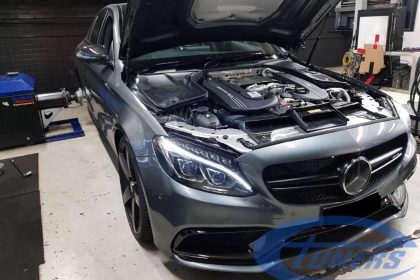 We installed Etuners Hybrid turbos and upgraded downpipes. A set of BMC air filters in the stock filterboxes and a custom Stage3 Etuners calibration to make use of the hybrid turbos.