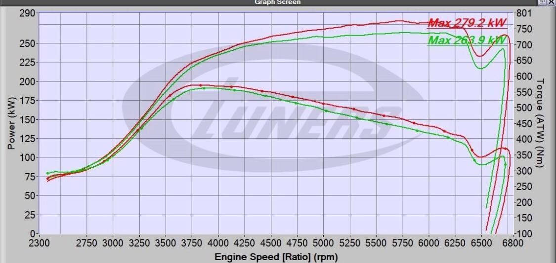 A base line run with Etuners custom file for upgraded downpipe, intake and hybrid turbo (compressor wheel only) saw 263wkw.