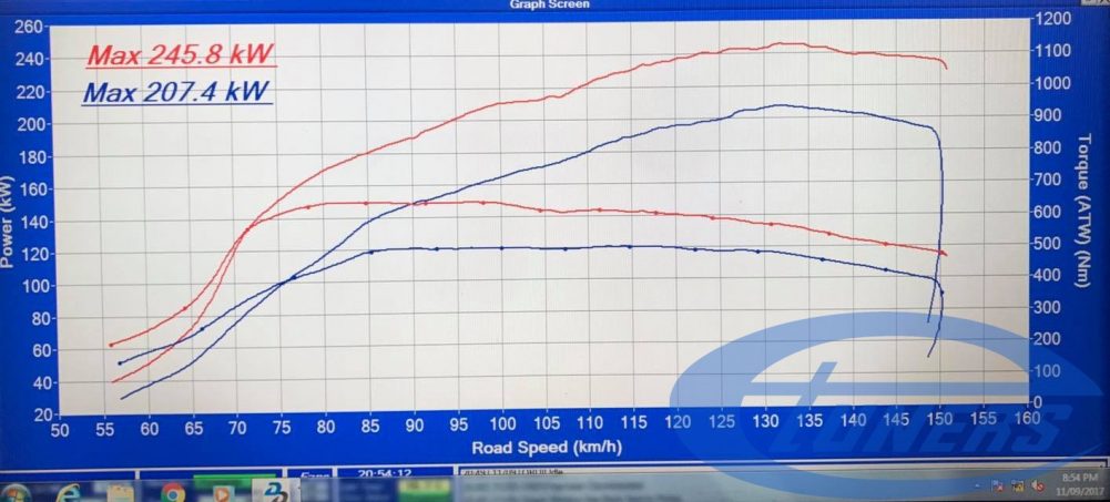 Great gains from the 3.0 liter V6 twin turbo, with an M276 motor. With an Etuners custom stage 1 tune only, peak power increased from 207kw to 245kw at the wheels. Midrange gains of 40kw and improved throttle response totally transform this car on the street!