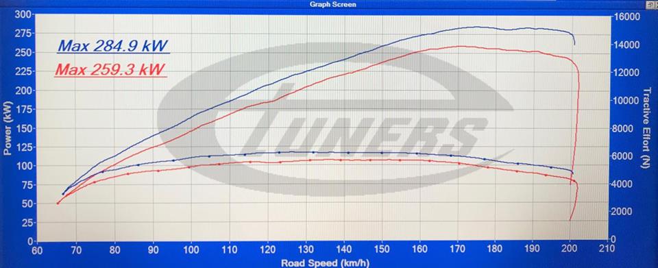 - Maximum wheel power: 285wkw (measured stock 259wkw), gains 26wkw
