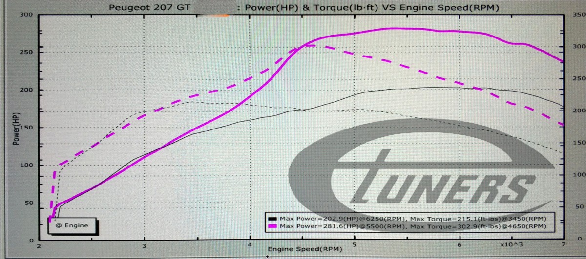 Peugeot 207 GT 1.6T (150hp) – Etuners Stage 4 JCW hybrid + cams