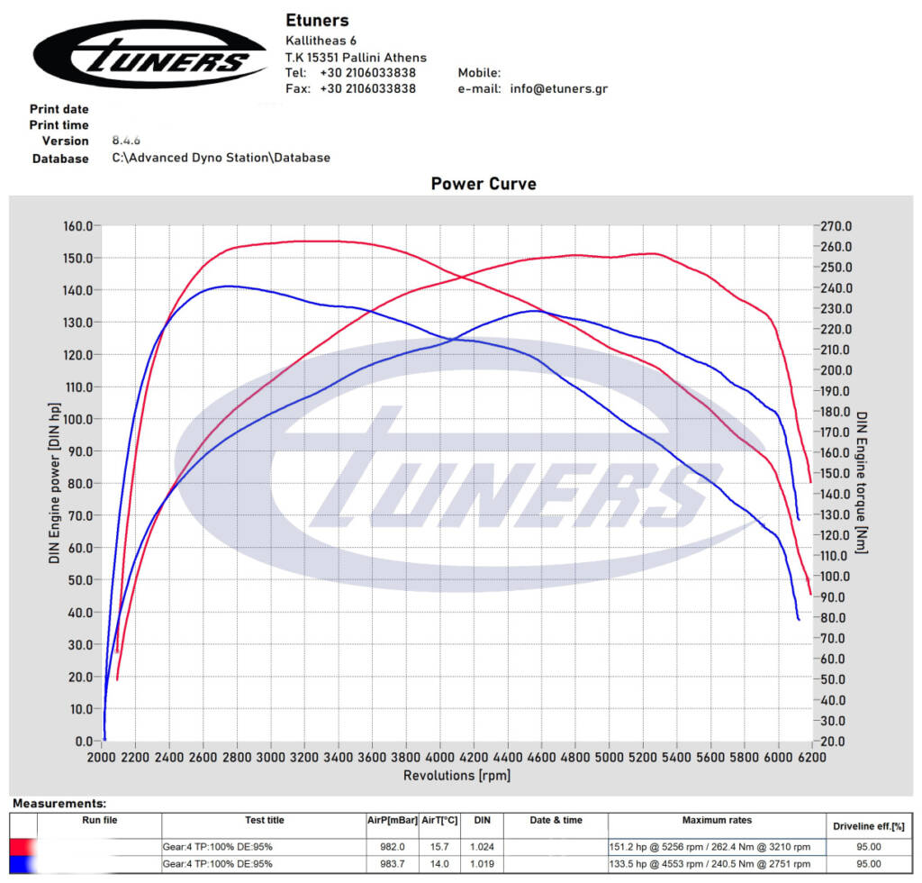 - Maximum engine torque: 262Nm (measured 240Nm stock), gains 22Nm