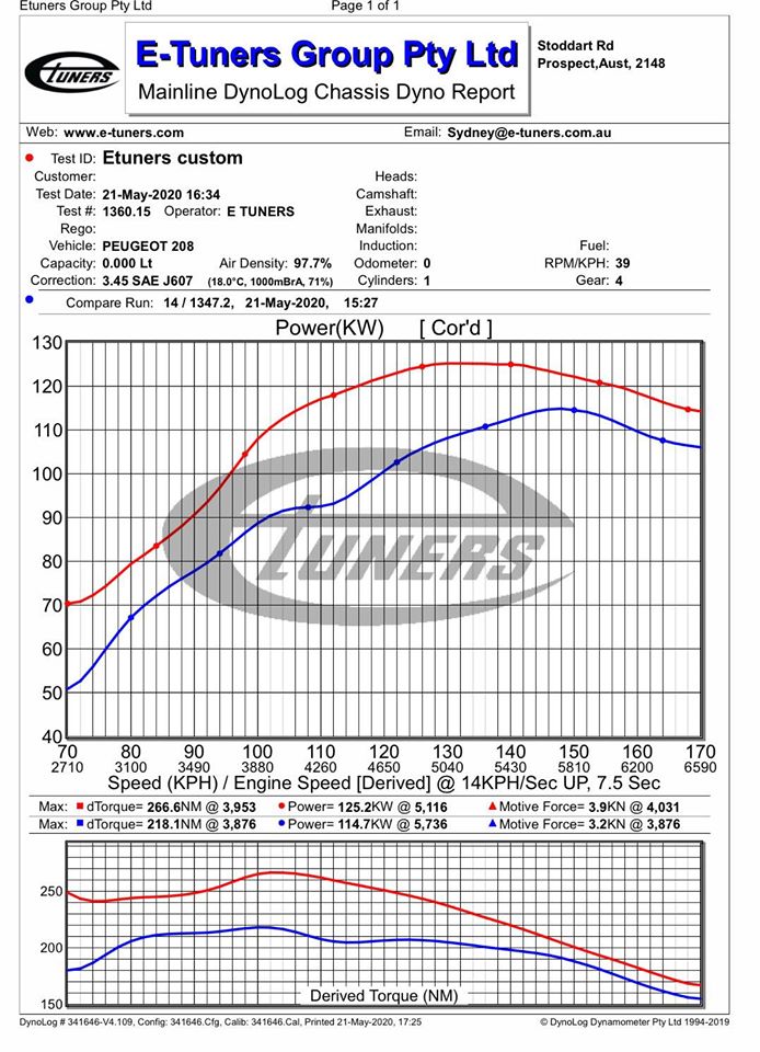 A pre tune Dyno run saw a best of 114kw @ the wheels. With a custom stage 1 Etuners file calibrated peak power increased to 125kw. Midrange gains of +20wkw, combined with sharper throttle response left the GTi struggling for traction on the street.