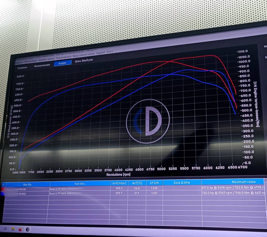 Big total gains in torque and power even from low revs, limited only by the need for a gearbox tune. The maximum combined power Power Unit power reached 817whp / 940hp and torque exceeded 1100Nm at the wheels. This was RS6 C8 performance together with a powerful electric motor and battery on top.