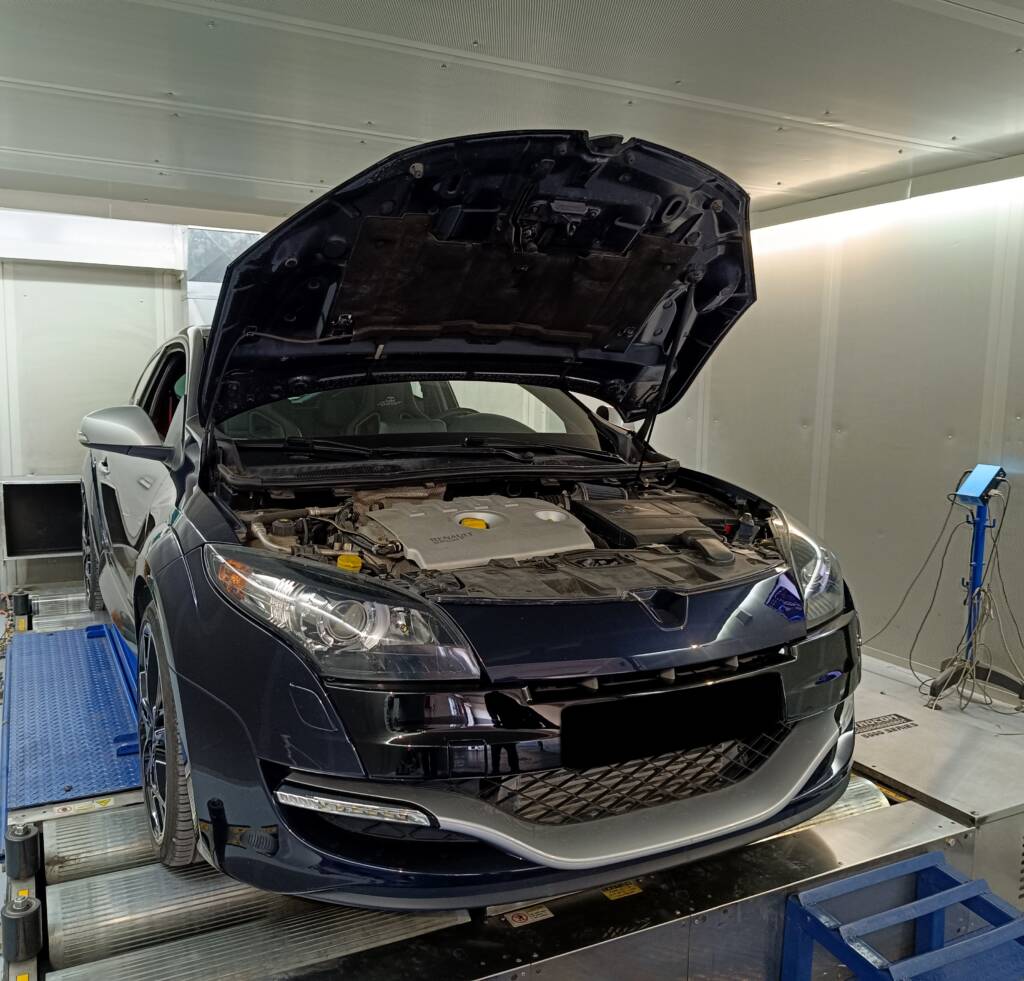 It is a Renault Megane RS Cup with big brakes, a limited-slip differential, close ratio 6speed gearbox, racing suspension, a 2liter cast-iron turbo F4RT engine and 275hp stock on 98 octane fuel. It has different driving modes, selectable by the driver. Tame in city driving but a beast on the track.