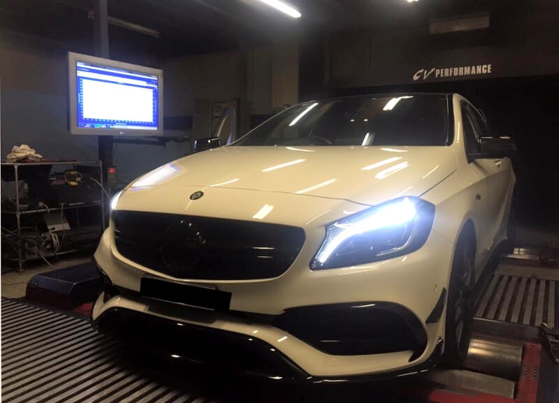 Mercedes A45 AMG – Stage 1 98RON This is the latest version of the Mercedes A45 AMG, which delivers 280kw flywheel power from the factory. As delivered to CV Performance, the A45 dynoed at 209kw at the wheels measured as 4wd. A rear muffler delete was performed along with a custom tune...