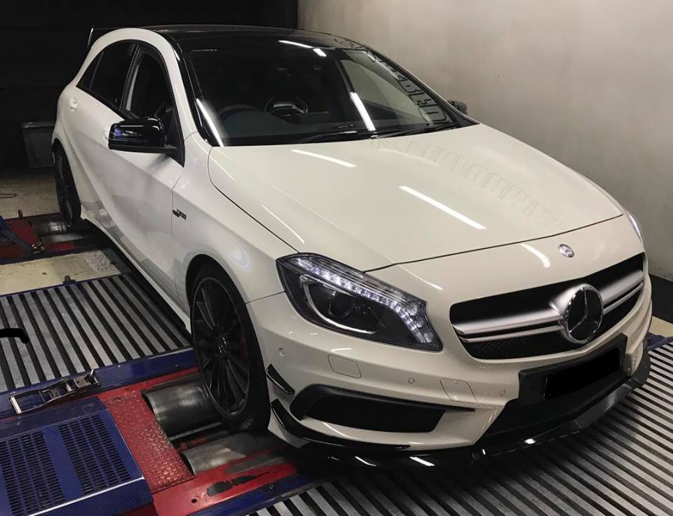 Mercedes A45 AMG 2.0T W176 MY2013 Our pre tune Dyno run with upgraded intake saw 214kw at all 4 wheels. A custom 3 1/2” downpipe was installed with an Etuners Stage 2 file. Peak power increased to 260wkw with gains of +90wkw in the midrange. Upgrade specifications 98RON fuel Upgraded air intake...