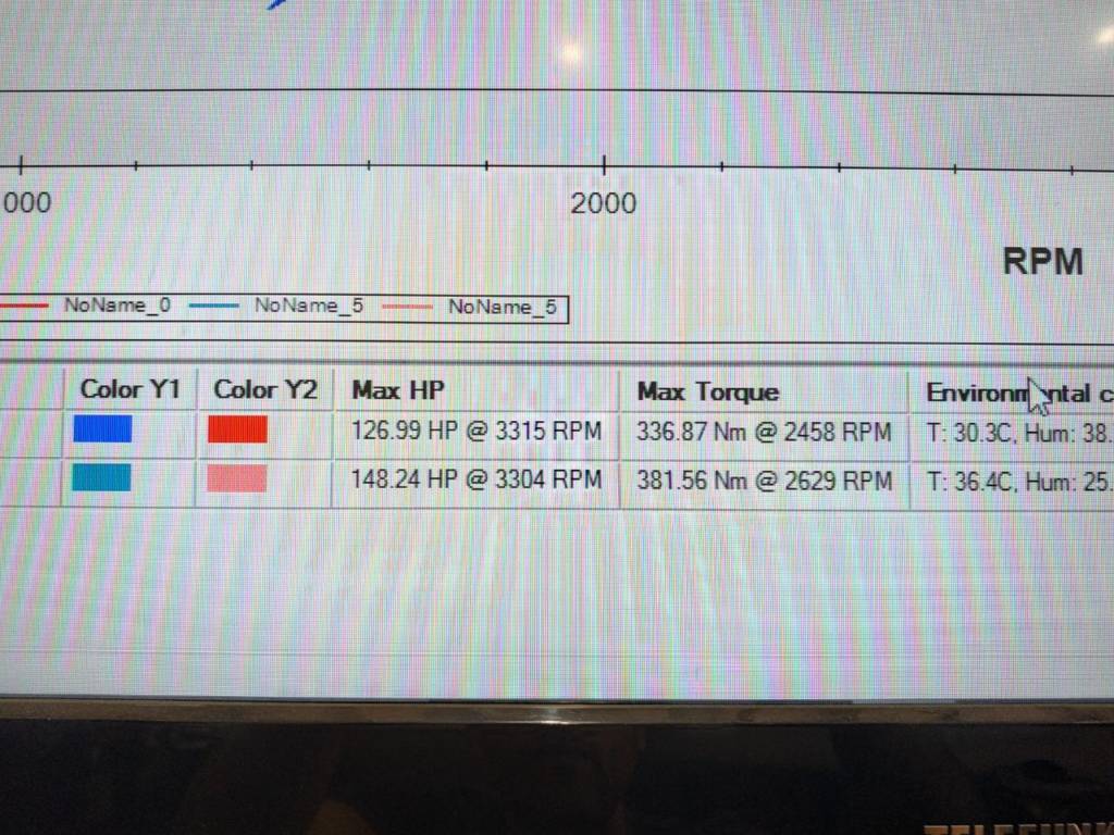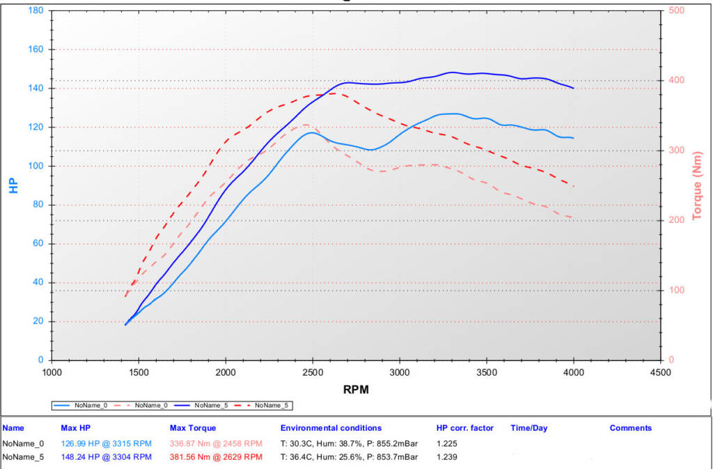 - Maximum power: 148.24whp (measured stock 126.99hp), gains 22whp