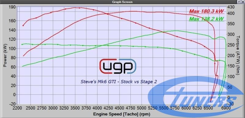 Steve’s clean, sleeper spec Mk6 GTI, stock to stage 2. Gains of 42kw and 180nm to the front wheels! All made possible by: